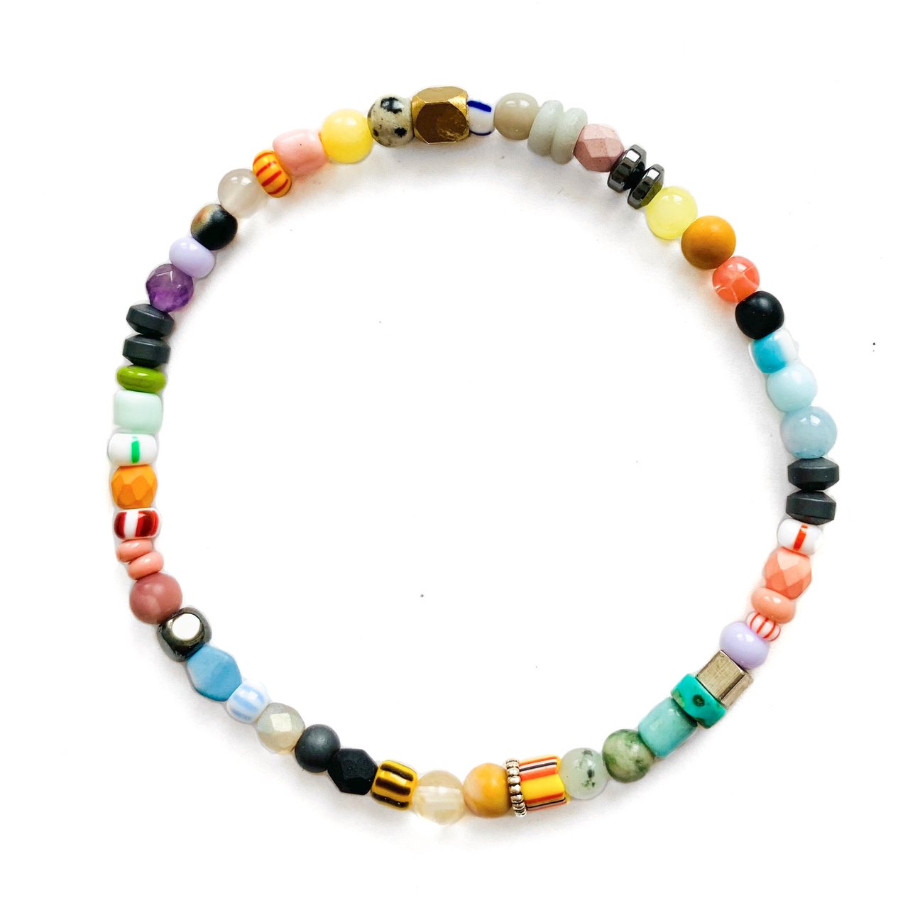 Peu importe qui vous êtes, chaque personne soucieuse des tendances devrait porter des bracelets colorés cette saison. Surtout cet arc-en-ciel de teintes douces et dures sera la palette de couleurs incontournable. Pastel mais différent. Ce bracelet élastique est enfilé d’Agate, Jaspe, Quartz, Mokaite, Hématite, Pyrite, Argent 925, Verre (vintage), Laiton et autres. Taille des perles 4mm.