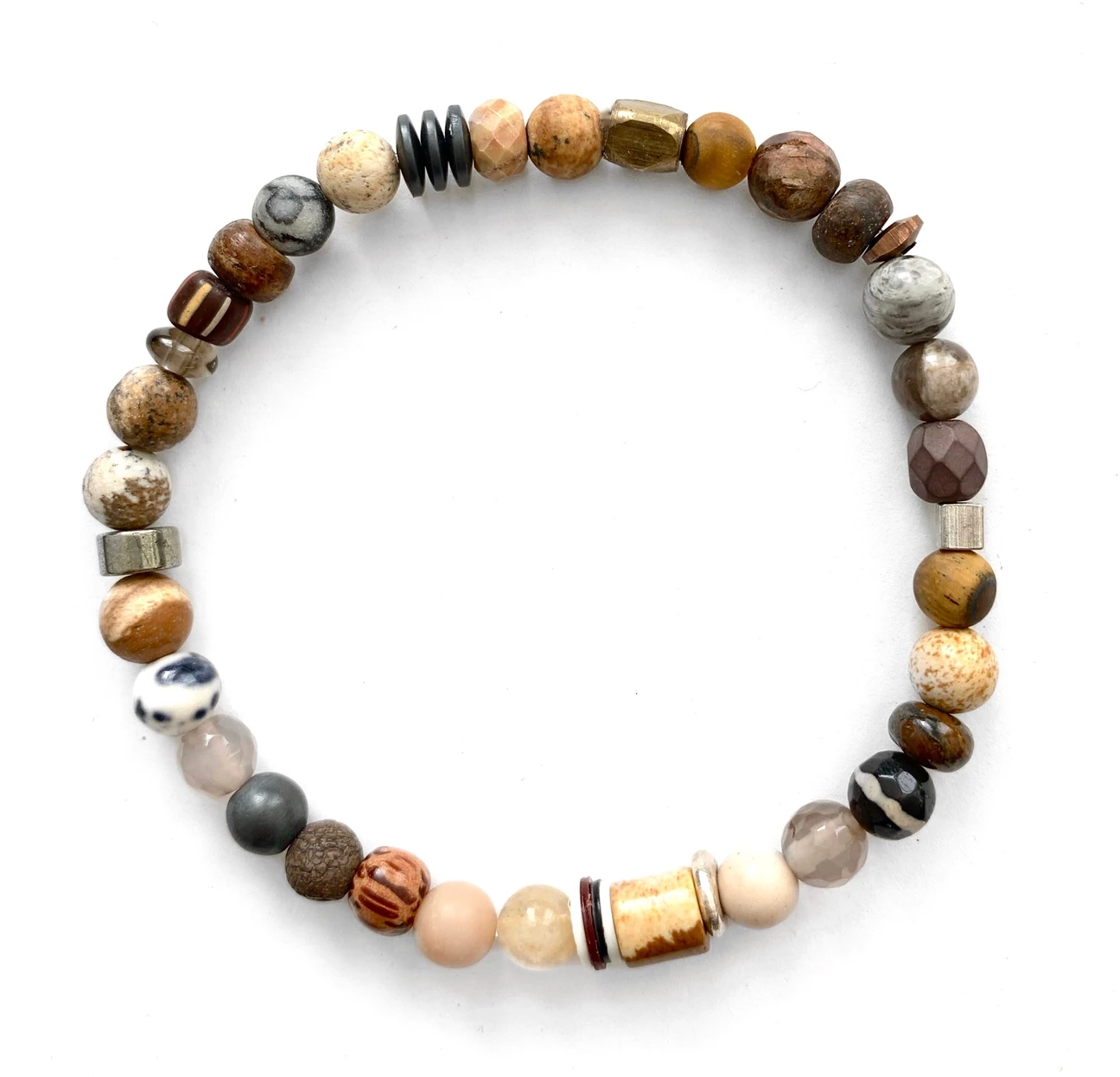 Le bracelet multicolore ‘Sand-Tone’ est fabriqué à partir de : Jaspe, Ebony, Tigereye, Mookaite, Hematite, Quartz, Jade, Pyrite, Silver925, (vintage) Glass perles, Antique Brass a.o.