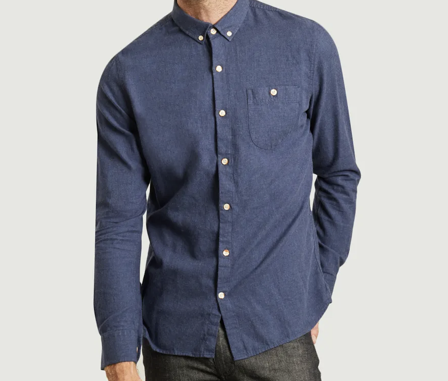 Chemise en flanelle de coton biologique légèrement brossée bleu marine, coupe droite, manches longues, poignets ajustables à un bouton, col américain, patte de boutonnage centrale, une poche plaquée poitrine boutonnée.