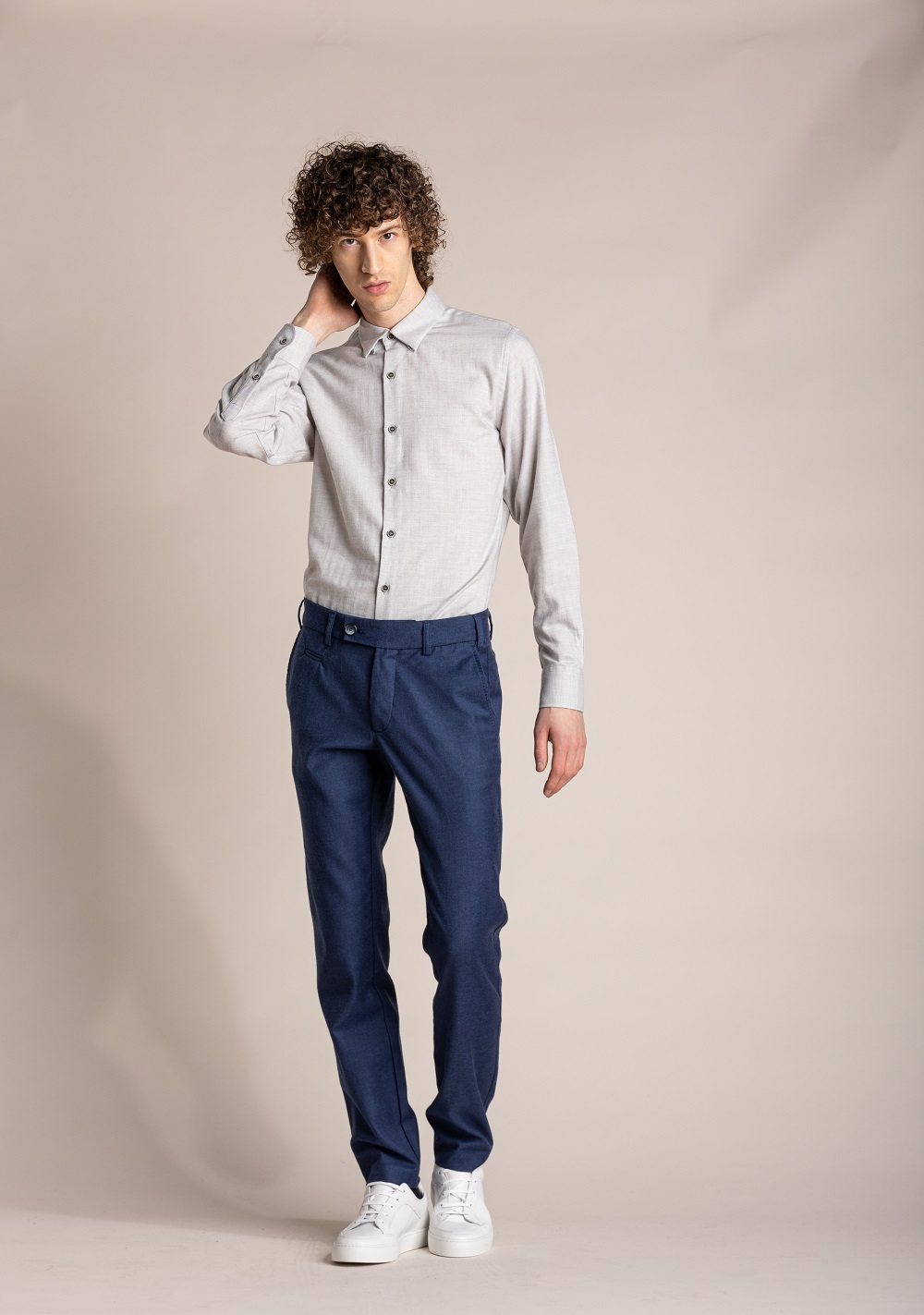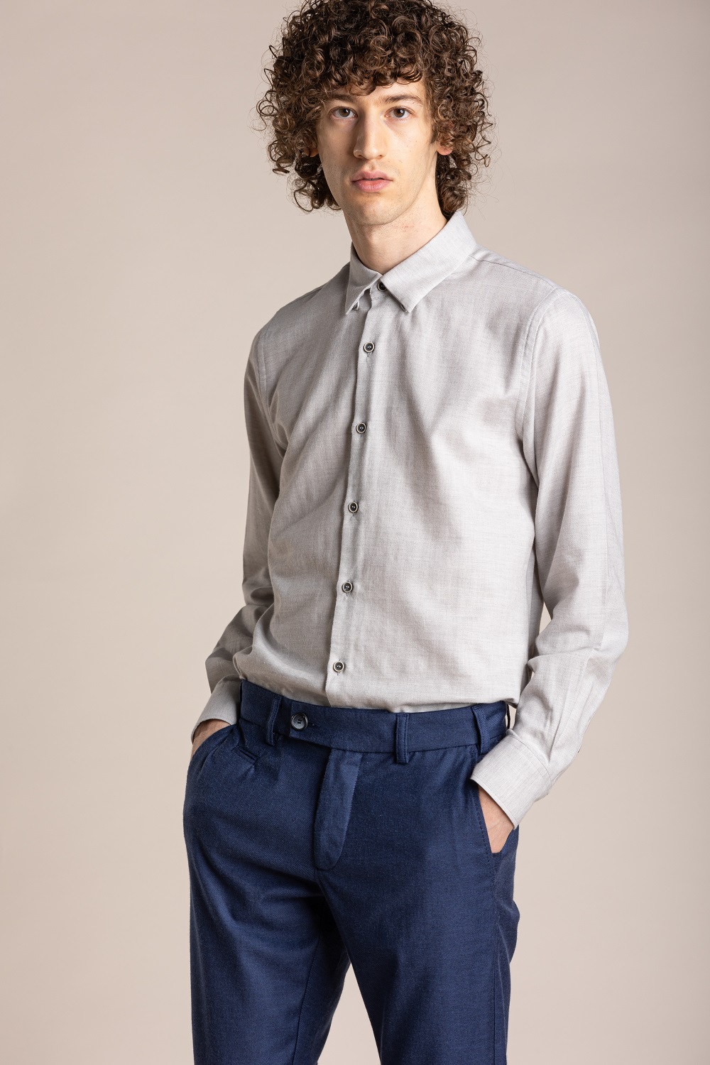 Chemise en flanelle de coton de grande qualité. Couleur gris clair chiné. Les manches longues avec des détails aux épaules, un col français boutonné avec des boutons sous pattes de col, et enfin le fit ajusté font de cette pièce un incontournable des saisons automne hiver.