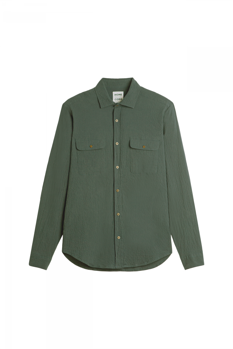 CHEMISE EN COTON BIOLOGIQUE. POCHES PLAQUÉES À RABAT. BOUTONS EN COROZO. COUPE DROITE. COLONNE VERTÉBRALE PIQUÉE EN ROUGE.