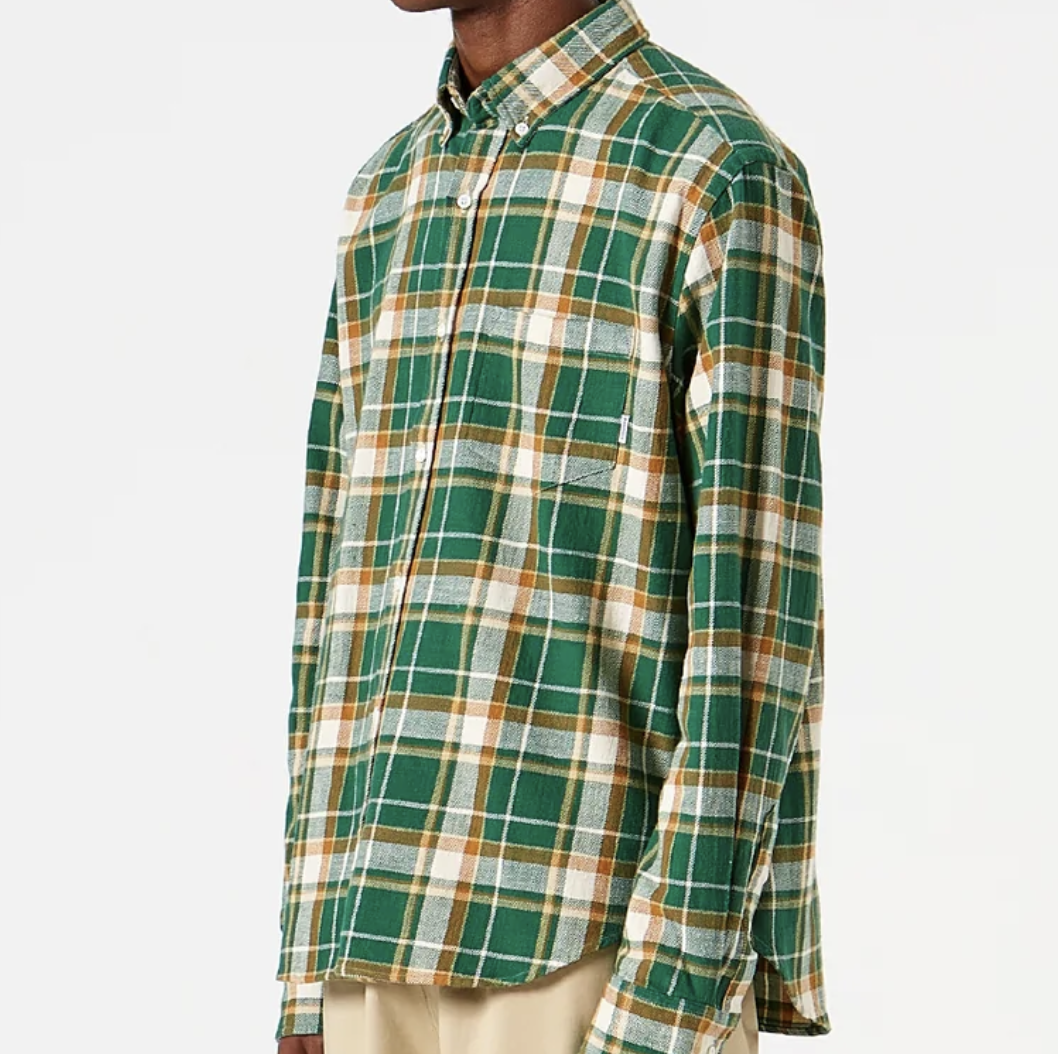 Chemise à carreaux boutonnée de couleur verte. Elle comporte une poche plaquée avec un détail Edmmond sur la poitrine gauche.