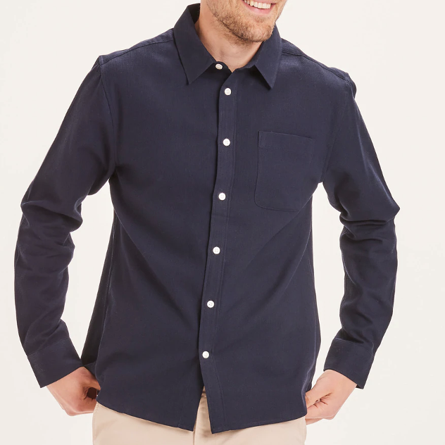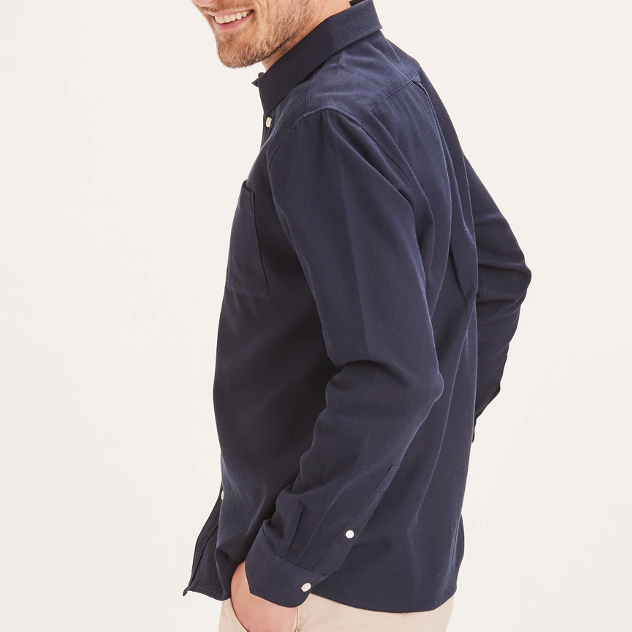 La chemise a des manches longues et une seule poche poitrine.
