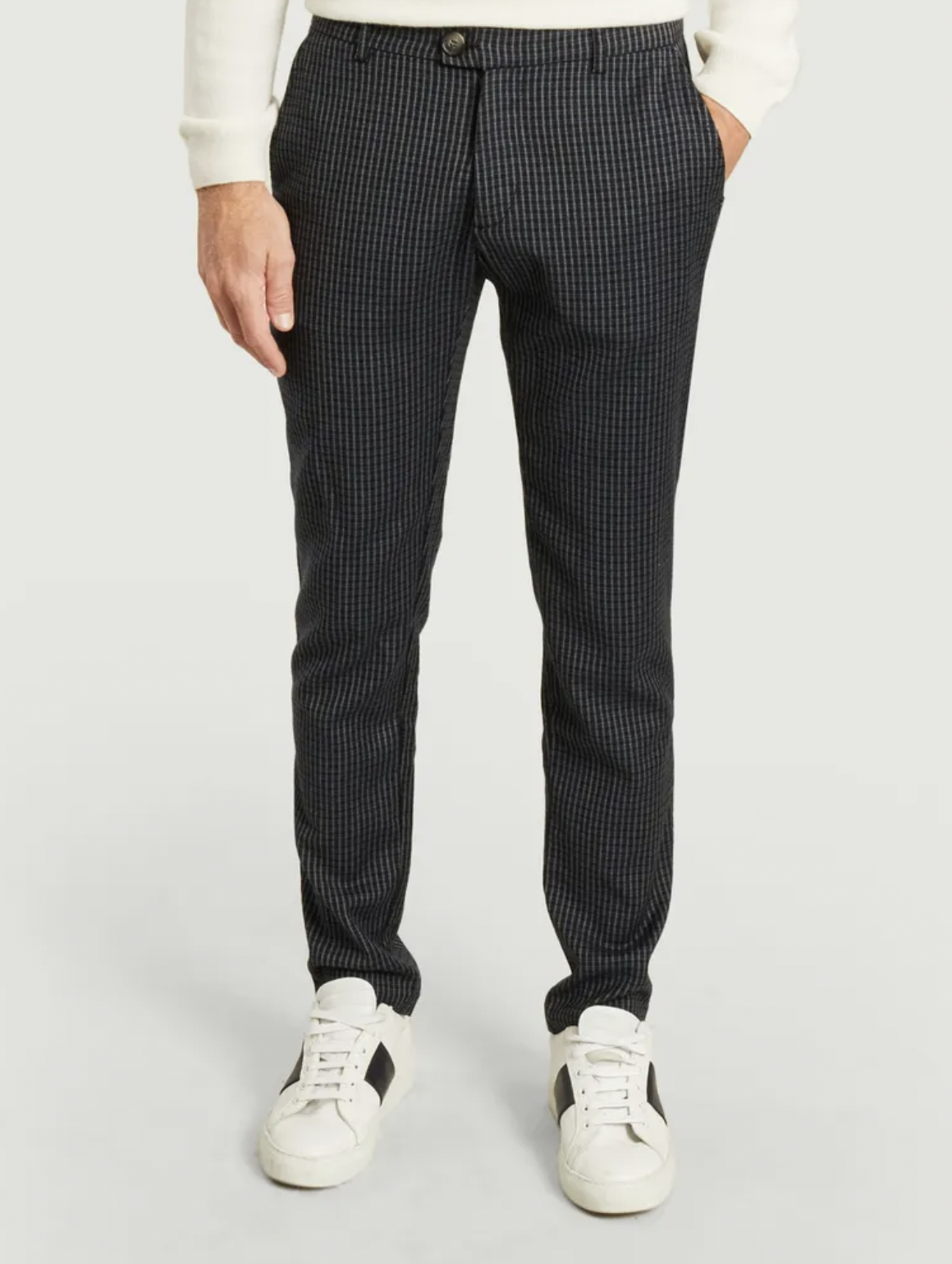 Pantalon confectionné en laine mélangée de coloris bleu marine à carreaux.