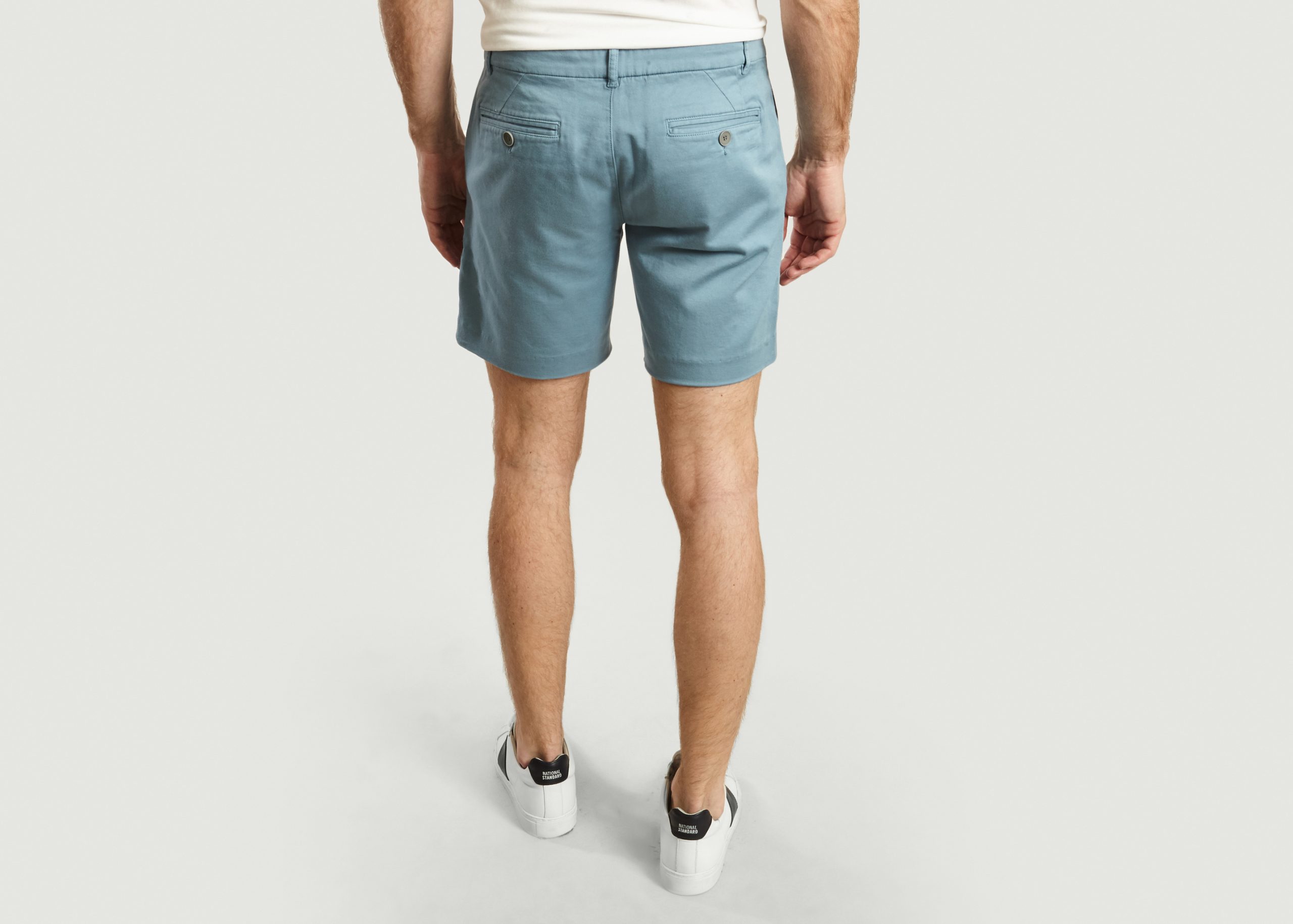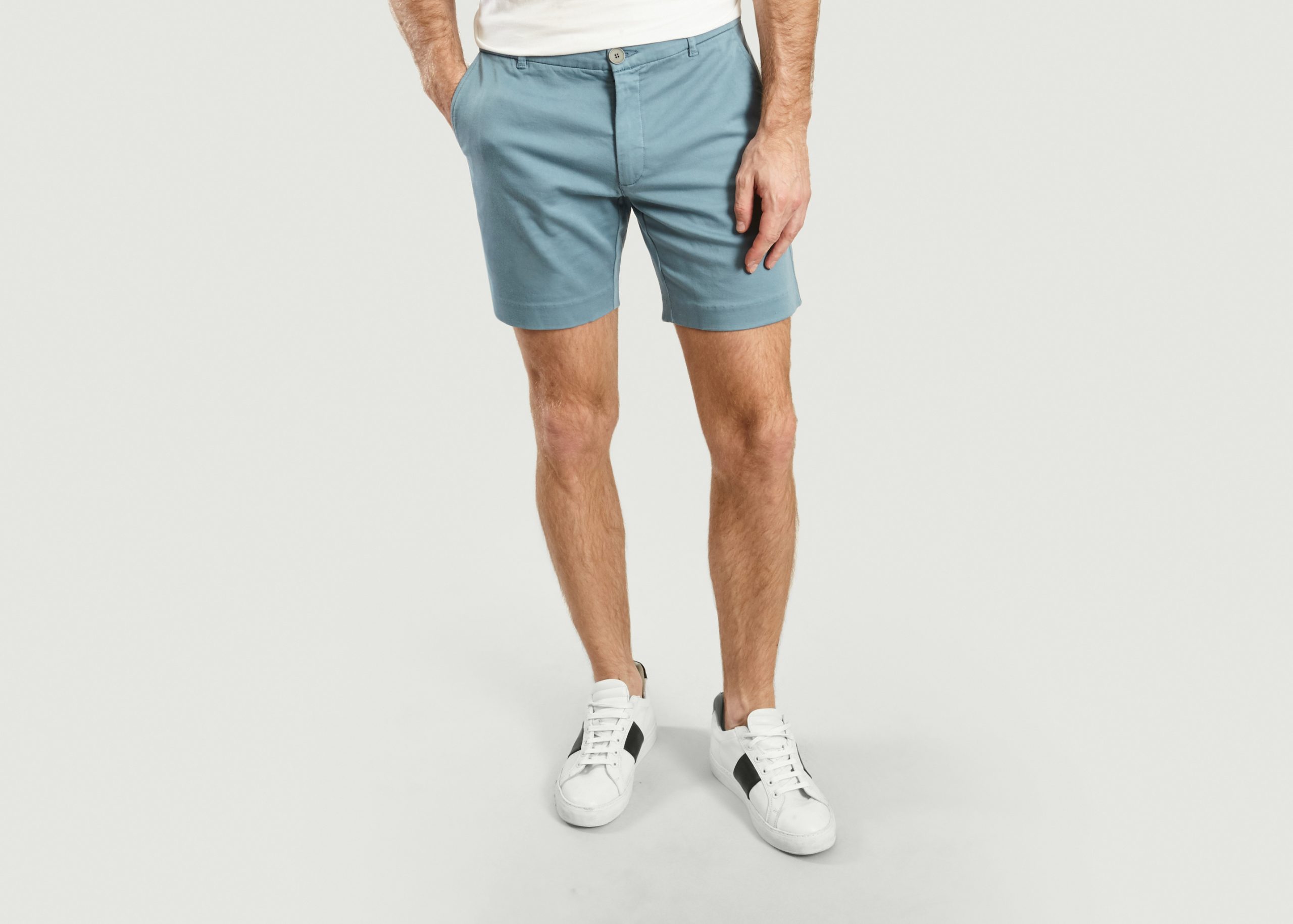 Short décontracté en coton stretch de couleur bleu , 2 poches devant, 2 poches passepoilées derrières, coupe tailleur ajusté, en tissu fabriqué au Japon de grande qualité. Parfait pour habiller une tenue des beaux jours en toutes circonstances. Avec une touche d’élasthanne et de lycra, le confort est garanti avec une longueur de jambe de 42 cms (niveau cuisse).