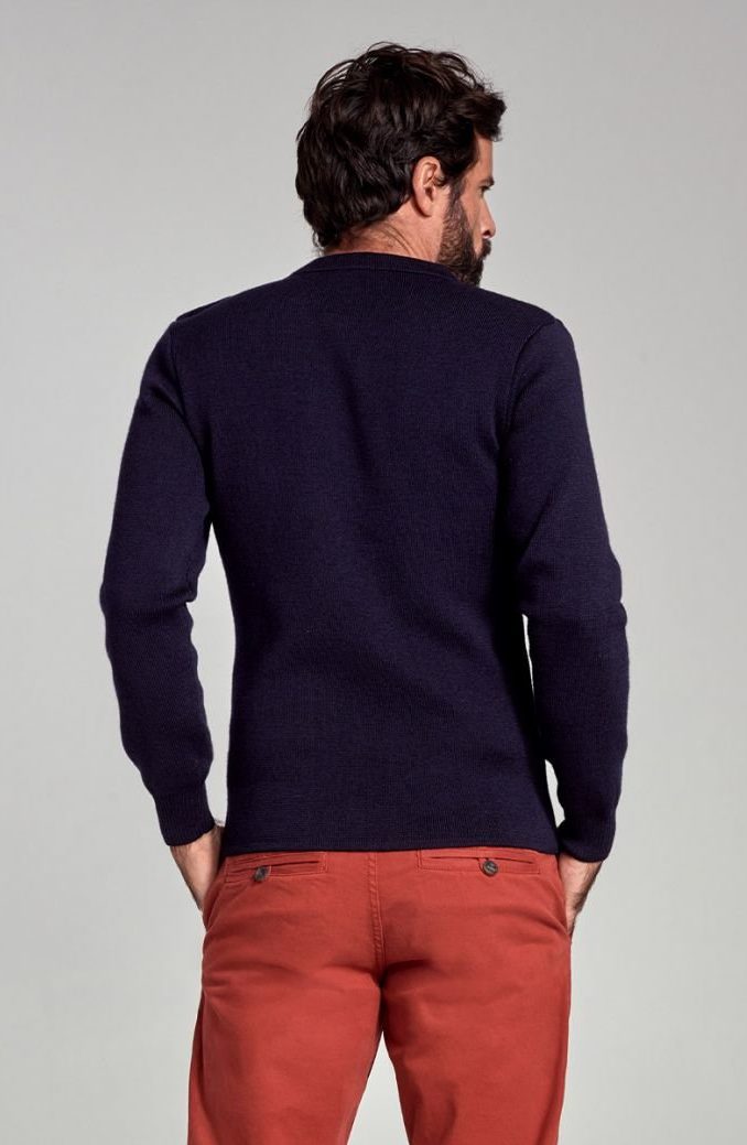 Pull marin Fouesnant en laine, couleur bleu marine “Navire”, col rond, manches longues, épaule gauche boutonnée, étiquette “Armor Lux” cousue sur le bas, coutures et finitions ton sur ton.