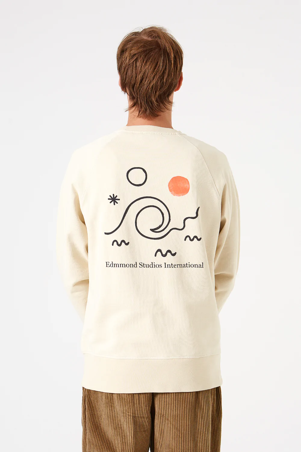 Sweat col rond beige. Fabriqué en coton 100% biologique. Il a un col, des poignets et un ourlet côtelés. Il est complété par une illustration au dos.