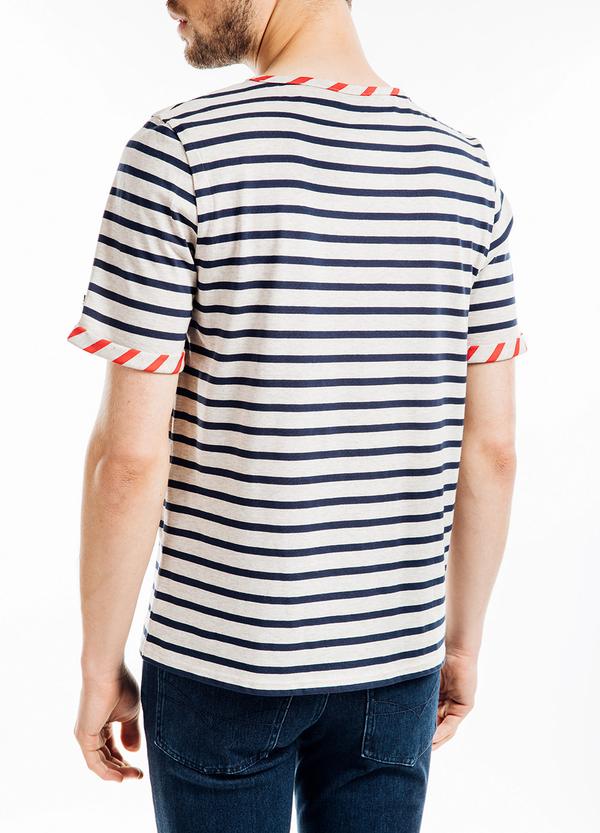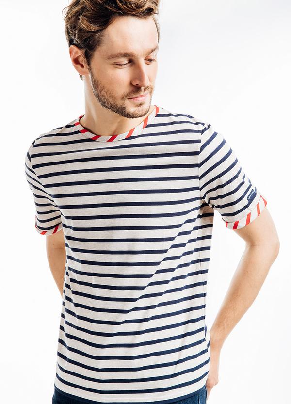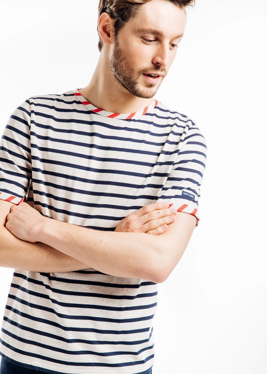 Nouvelle version de la Marinière SAINT JAMES manches courtes, le modèle Beaulieu est confectionné dans nos ateliers en coton biologique avec contrastes au col et au bas des manches.