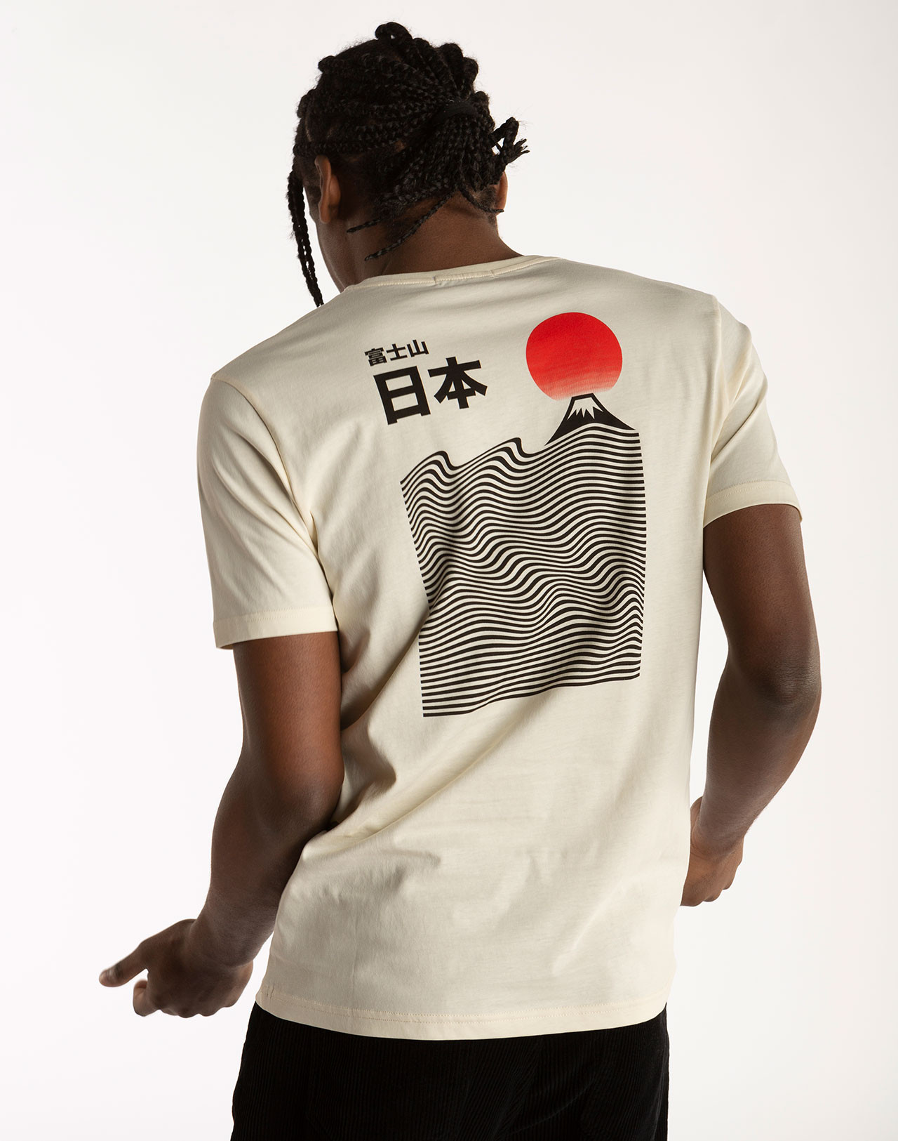 T-shirt col rond écru avec sérigraphies poitrine et dos par l’artiste Alex Omist.
