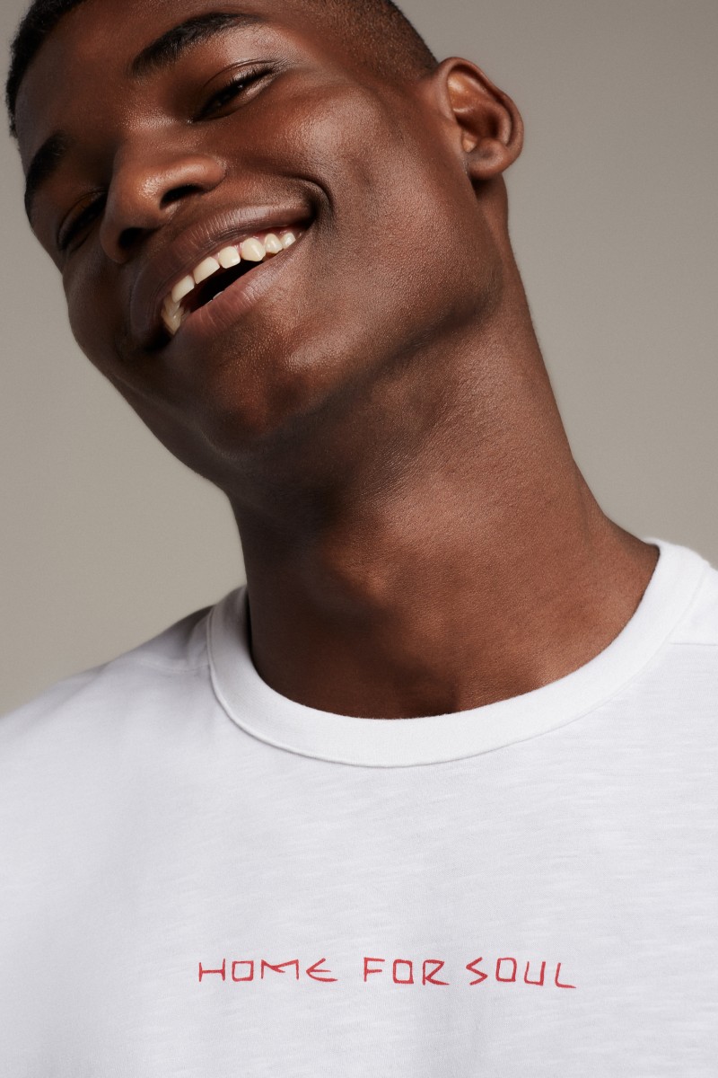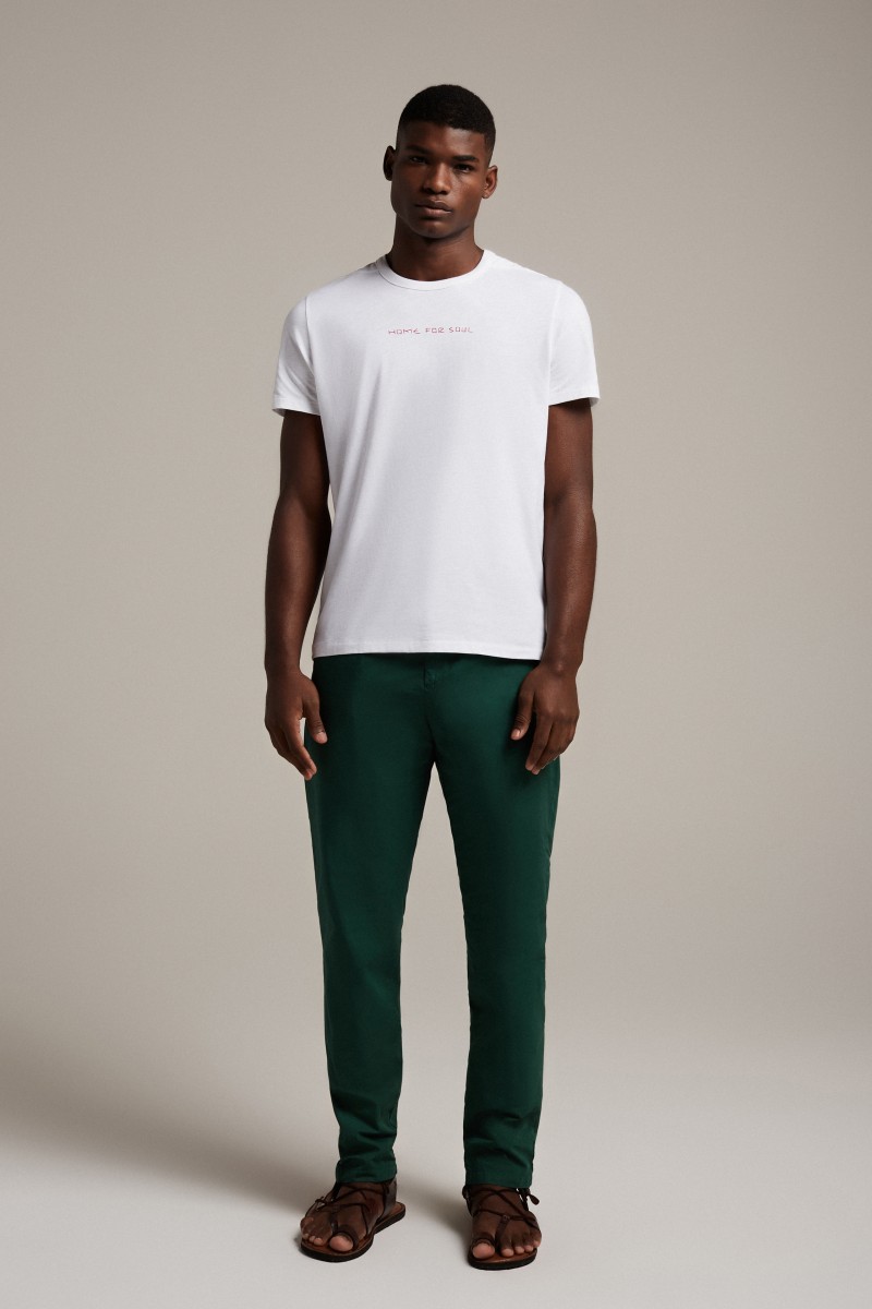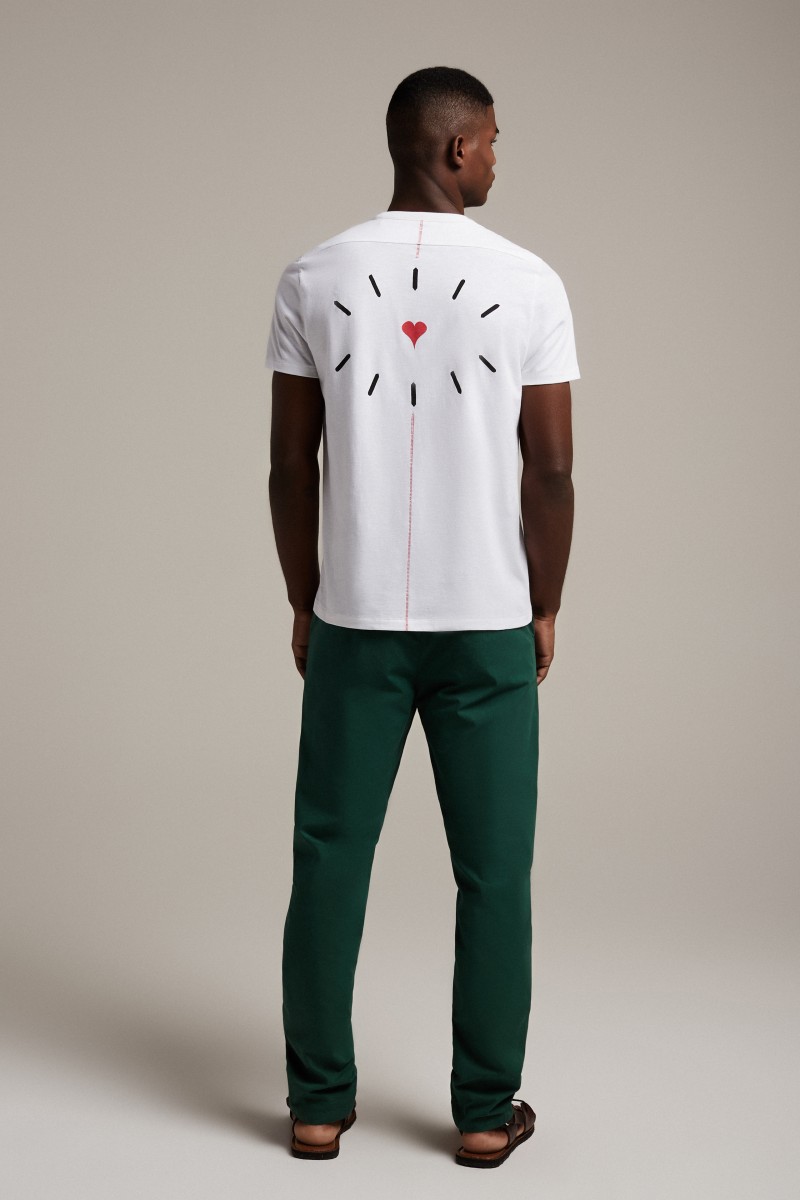 T-SHIRT À MANCHES COURTES EN COTON FLAMMÉ BIOLOGIQUE MARQUÉ À LA CLAVICULE. COUPE CLASSIQUE. COLONNE VERTÉBRALE PIQUÉE EN ROUGE.