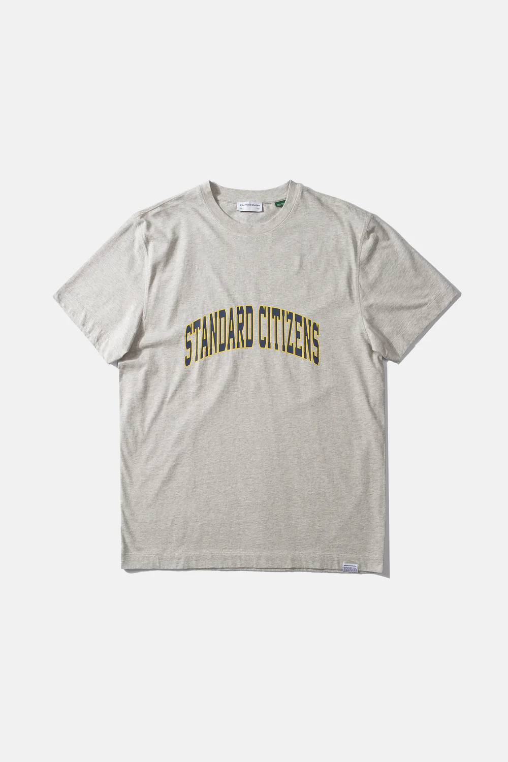 T-shirt gris à manches courtes. Fabriqué en coton 100% biologique. Au centre de la poitrine, vous pouvez voir le texte “STANDARD CITIZEN”.
